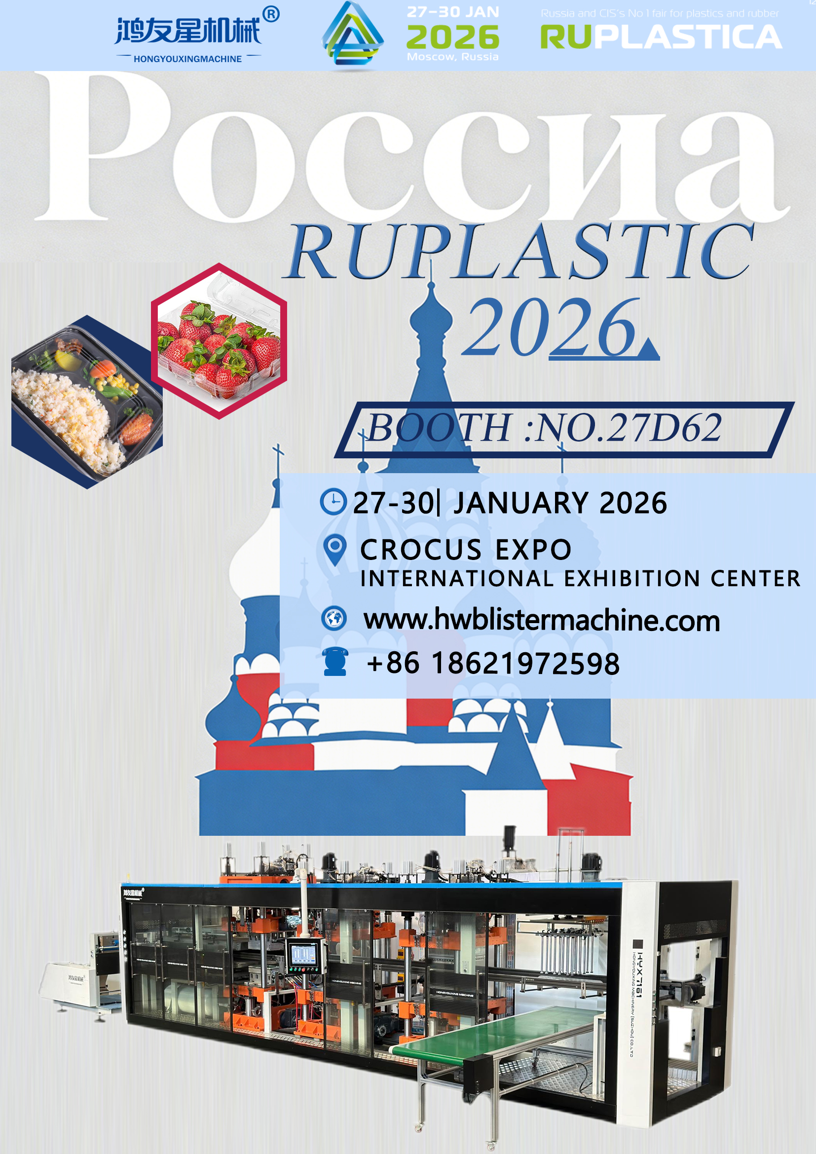 HONGYOUXING STROJRY (SUZHOU) CO., LTD. sa zadovoljstvom najavljuje svoje sudjelovanje u RUPLASTICA 2026 , vodeći međunarodni sajam plastike i gume u Rusiji i CIS regiji. Izložba će se održnai od 27. – 30. siječnja 2026 at Međunarodni izložbeni centar Crocus Expo , Moskva, Rusija.